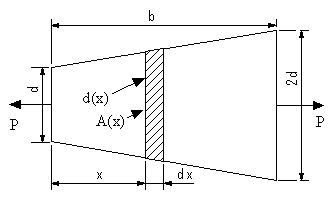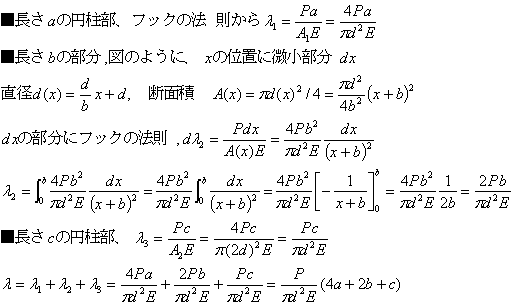 図のように直径dの長さaの円柱の部分、直径dから2dに変化する長さbの部分、直径2dの長さcの円柱の部分からなる部材に引張荷重Pが作用する場合に、この部材の伸びを求める。ヤング係数をEとする。