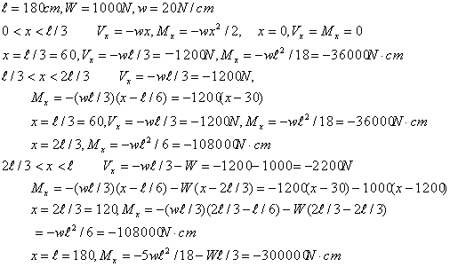 図2の場合の片持ち梁に等分布荷重w、集中荷重Wが作用するときに、せん断応力線図と曲げモーメント線図を求める。ただし、L=180cm, W=1000N,w=20N/cm