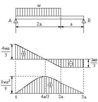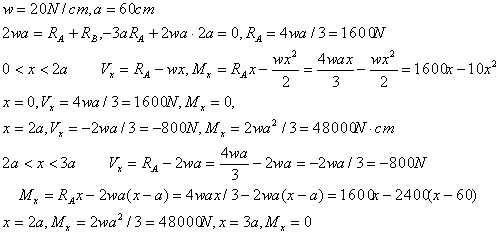 図1の場合の両端支持はりに等分布荷重wが作用するときに、せん断応力線図と曲げモーメント線図を求める。ただし、w=20N/cm, a=60cm