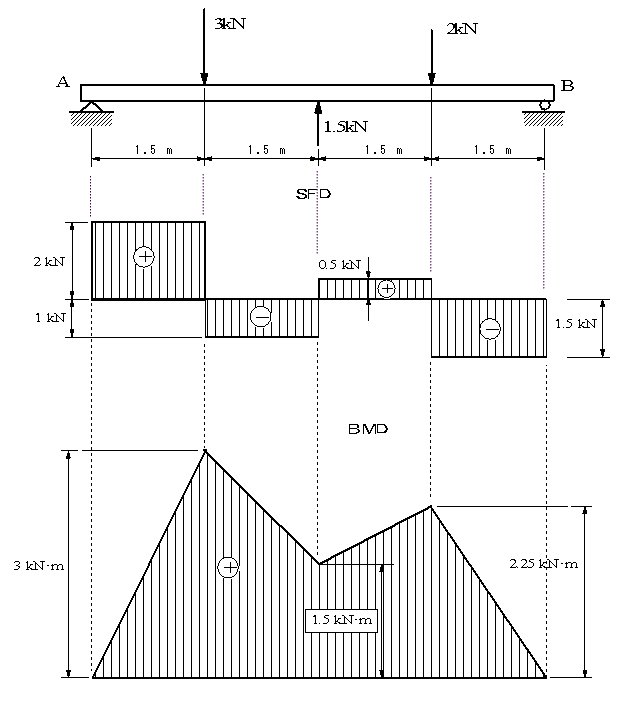 従って、せん断力図、曲げモーメント図は次のようになる。