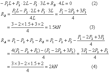 モーメントの釣り合いから(2)式が得られる。(1),(2)式から反力R