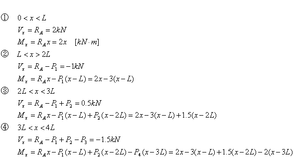 各区間におけるせん断力、曲げモーメンは次のようになる。