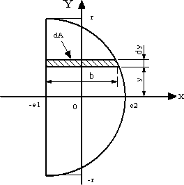 図の半径rの半円形状の断面二次モーメントを計算する。図心の位置、e1=0.4244r、e2=0.5756r