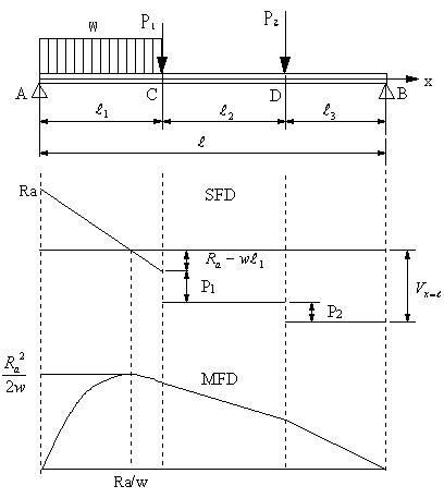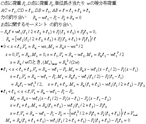 図の両端支持はりの場合に、せん断力、曲げモーメント、せん断力図、曲げモーメント図を求める。最大曲げモーメントはAC間で生ずるものとする。
