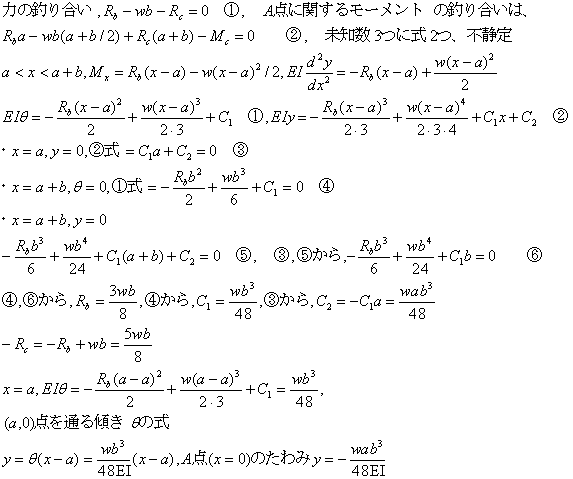 図の梁の場合のたわみの式と最大たわみを求める。
