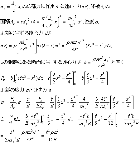 の円錐状の弾性棒(長さL,ヤング率E,密度p)を、角速度ωで回転させる。棒の先端の変位を求めよ。