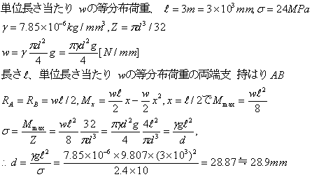 長さ3mの断面が円形の鋼の単純支持の場合に、自重によって生ずる曲げ応力を24MPaになるようにする。はりの直径を求める。ただし、はりの単位体積あたりの質量は7.85×10-6 kg/mm