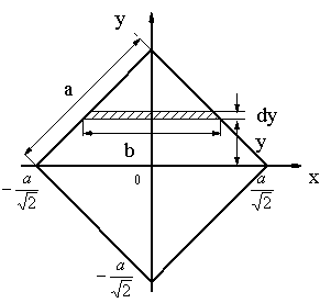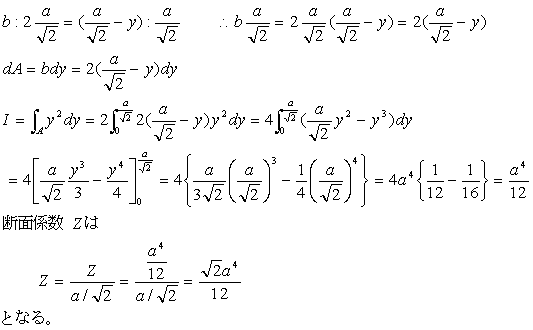 図1の一辺の長さaの正方形断面の断面二次モーメントは、図2から次のように求まる。 |