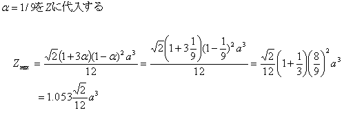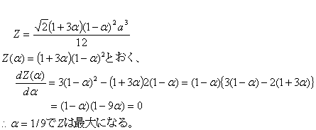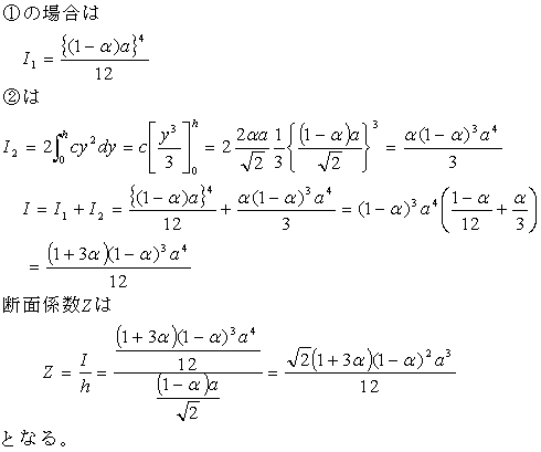 生ずる応力σは σ=M/Zであるので、断面係数Zを最大にするαを求めればよい。 |
