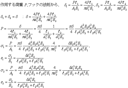 Aで固定され、直径とヤング率と長さが異なる棒を図のように組み合わせた棒のC面に荷重を加え、δだけ変位させた。このときの各棒に生じる各部の応力とひずみを求める。ただし、各部材の弾性係数をE