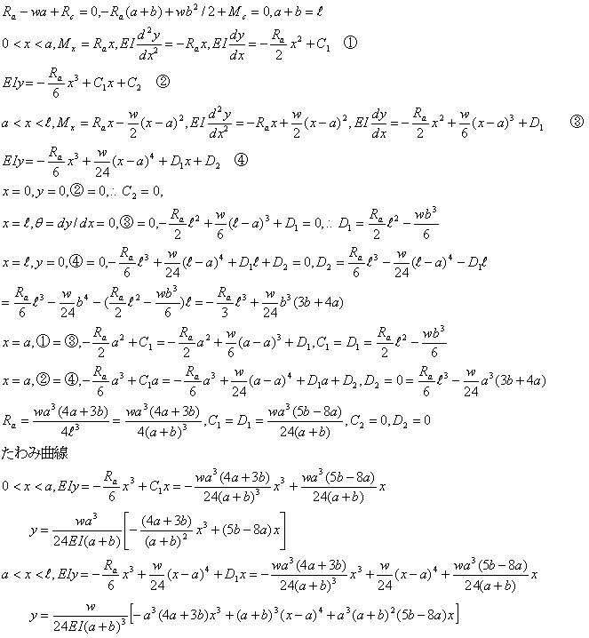 図の不静定の梁の場合に、たわみ曲線とA支点の反力を求める。
