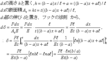 図に示す厚さtの台形板に引張荷重Pが作用した場合に生ずる伸びを求める。ただし、ヤング係数をEとする。