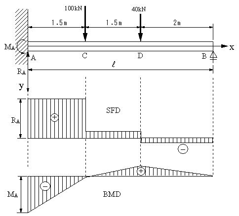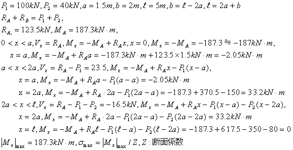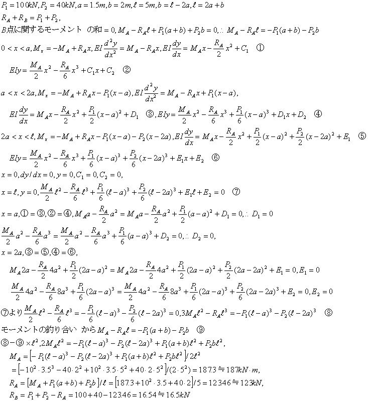 図の場合の梁において、A,B点における反力、A点におけるモーメントを求める。次に、たわみ曲線を求める。弾性係数E,断面二次モーメントIとする。