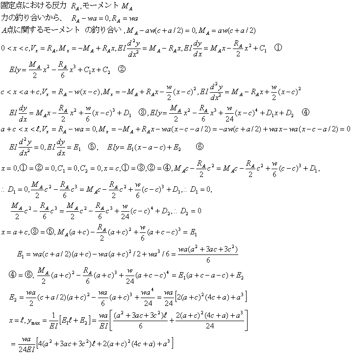 図の片持ちばりの場合にたわみの式と最大たわみを求める。