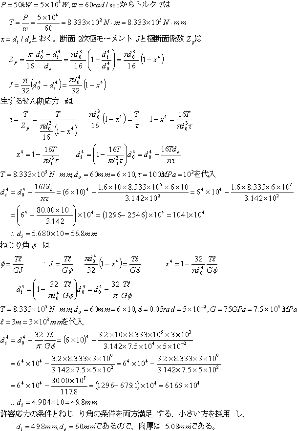 長さL=3m 外径do=60mmの中空軸が回転角速度ω=60rad/s で、動力P=50kWを伝達している。