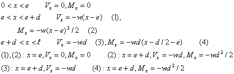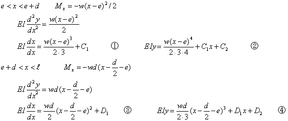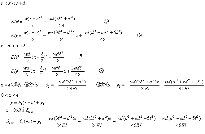 | たわみ角θ、たわみyの式に積分定数を代入し、整理するとD、E、F、G式と求まる。 0<x<eでは曲げモーメントは0であるので、はりは変形しない。D、E式のx=eの値から、はりの直線の式が求められる。 |