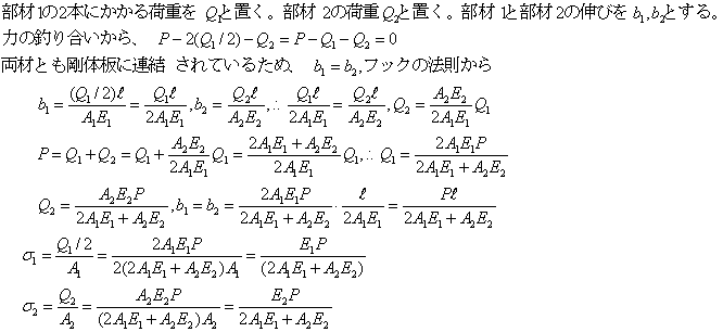 図に示すように2本の部材1と1本の部材2の両端が固定され、荷重力Pが作用する時、各部材の伸び、生ずる応力を求めよ。ただし、それぞれの部材の縦弾性係数をE