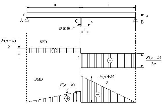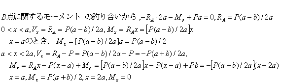 図の梁の場合に、せん断力、曲げモーメント、せん断力図、曲げモーメント図を求める。