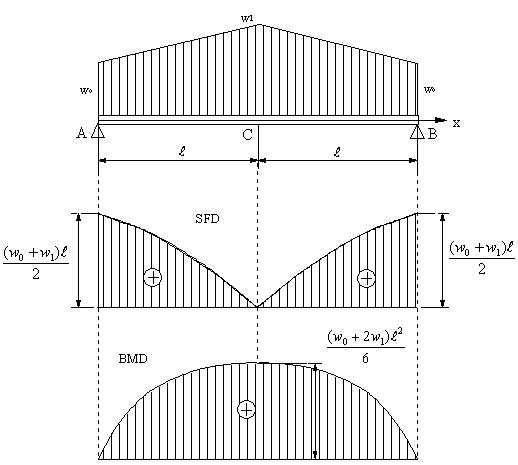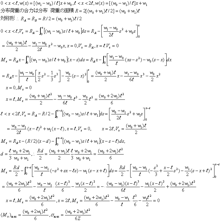 図のような分布荷重が作用する両端支持はりの場合に、せん断力、曲げモーメント、せん断力図、曲げモーメント図、最大応力を求める。断面係数はZとする。