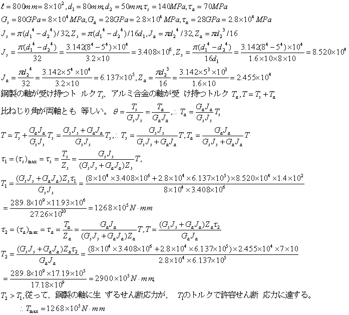 のアルミ合金の丸棒で製作された複合軸がある。鋼管、アルミ丸棒の許容せん断応力はそれぞれτ