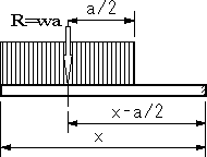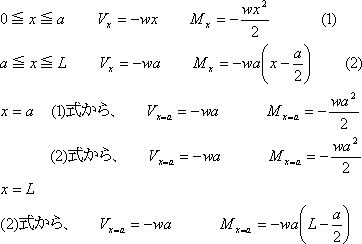 図3のように、a/2の距離に合力waが作用すると置き換えて考える。せん断力は−wa、xの位置から合力の作用点までの距離は(x−a/2)であるので、せん断力Vx, 曲げモーメントMxは(2)式のようになる。