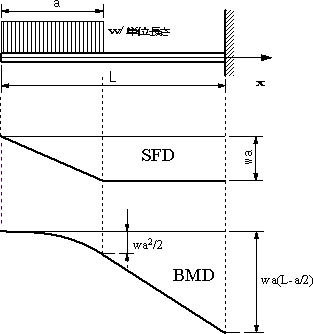 長さLの片持ちばりに自由端からaの範囲に単位長さ当たりwの等分布荷重が作用するとき、せん断力Vx, 曲げモーメントMxを求め、せん断力図と 曲げモーメント図を描く。