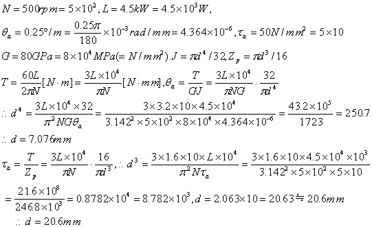 ただし、軸の許容比ねじれ角は1mあたり0.25度以下とし、軸の材料は軟鋼、許容せん断り応力τa=50MPa、横弾性係数G=80GPaとする。