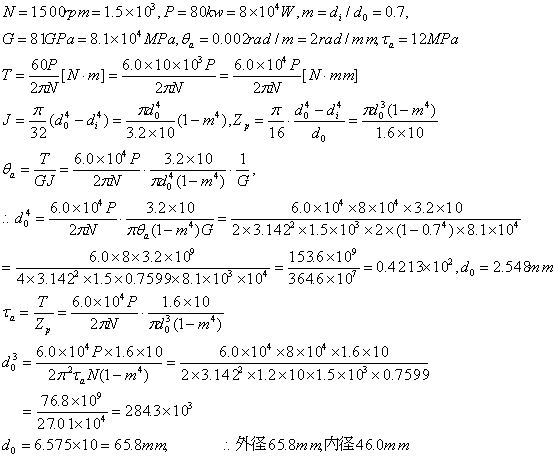 (2).回転数1500rpmで動力が80kWを伝えるのに強度的に安全な円筒軸の内径及び外径を求める。