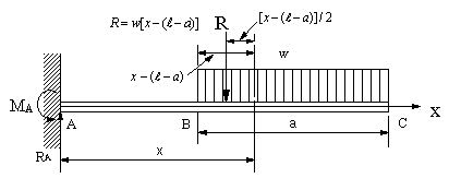 | (1),(2)を比較すると明らかに(2)の場合が求めるのに簡単である。ティモシェンコの書や小山、鈴木著「はじめての材料力学」では(2)の方法を採り、固定端は右側になるように図面を描いている。別ページ、はりの場合の座標軸の取り方等に示したように、日本の教科書では残念ながら、様々である。下記の図の様に固定軸を左側において、自由端にx軸の原点を置くと、簡単にせん断力と曲げモーメントを求めることが出来る。 |
