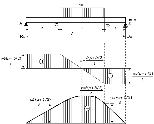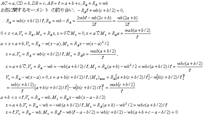 図の両端支持はりの場合、せん断力、曲げモーメント、せん断力図、曲げモーメント図、曲げモーメントの最大値と生ずる位置を求める。