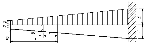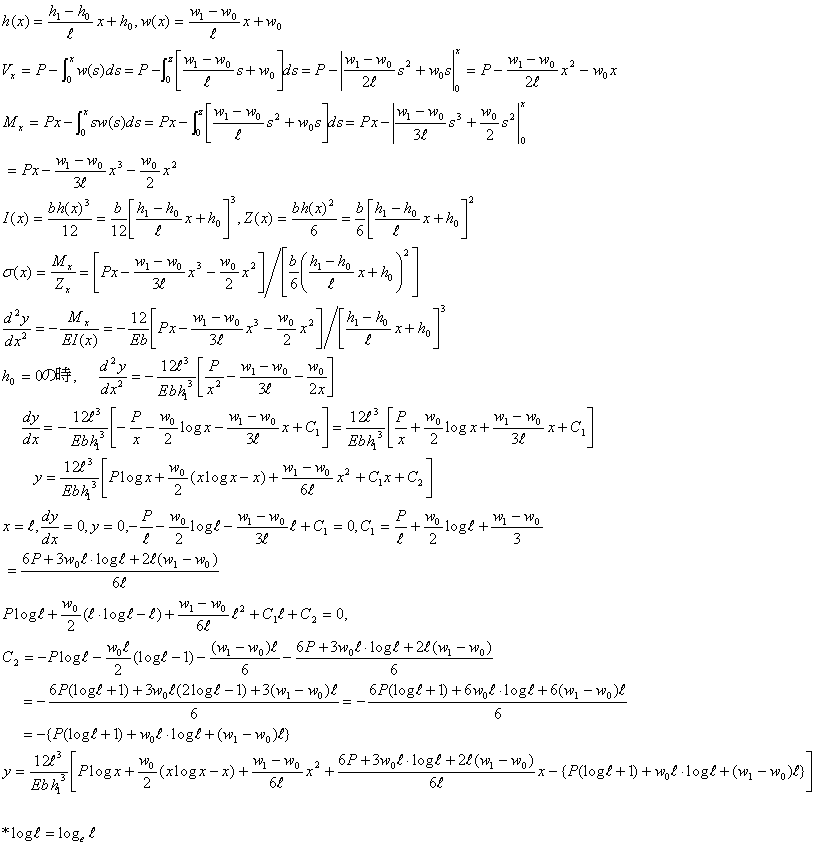 の分布荷重とPの集中荷重が自由端で作用するとき、自由端からxの位置に生ずるせん断力、曲げモーメント、生ずる応力を計算する。次に、自由端からxの位置に生ずるたわみを求める。たわみを求めるとき、計算を簡単にするために、h