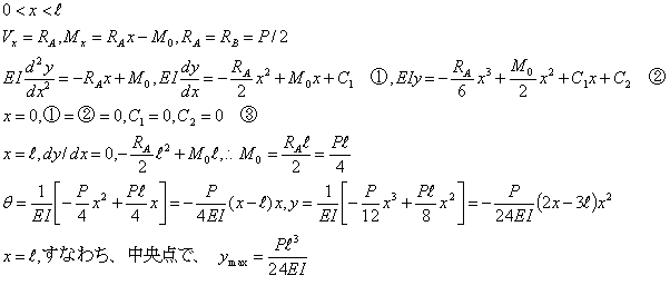 図の両端固定梁の場合にたわみ角とたわみ、最大たわみを求める。
