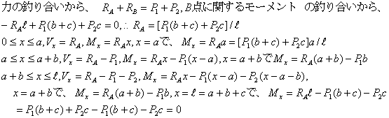 図の梁の場合に、せん断力、曲げモーメント、せん断力図、曲げモーメント図を求める。