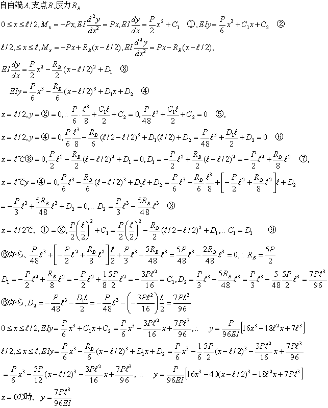 図の梁の場合に、たわみの式と自由端におけるたわみを求める。