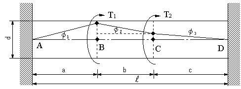 が作用するとき、軸AB,BC,CDに作用するねじりモーメント、各軸のねじれ角、各軸に生ずるせん断応力を求める。剛性率G,断面二次極モーメントJ,極断面係数Zp ,T