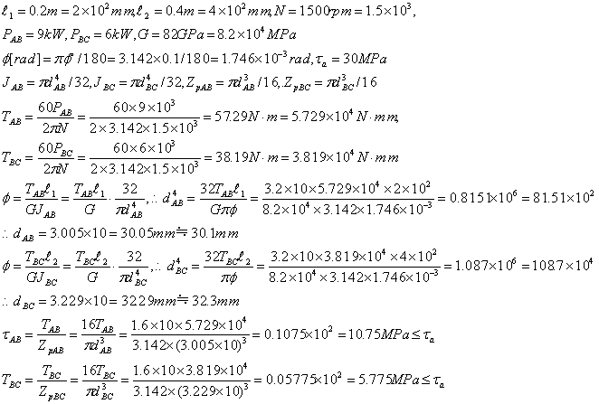 両軸のたわみ角φ=0.1°のとき、両軸の大きさを求め、この時、両軸に生ずる生ずるせん断応力が許容せん断応力以下であることを示せ。