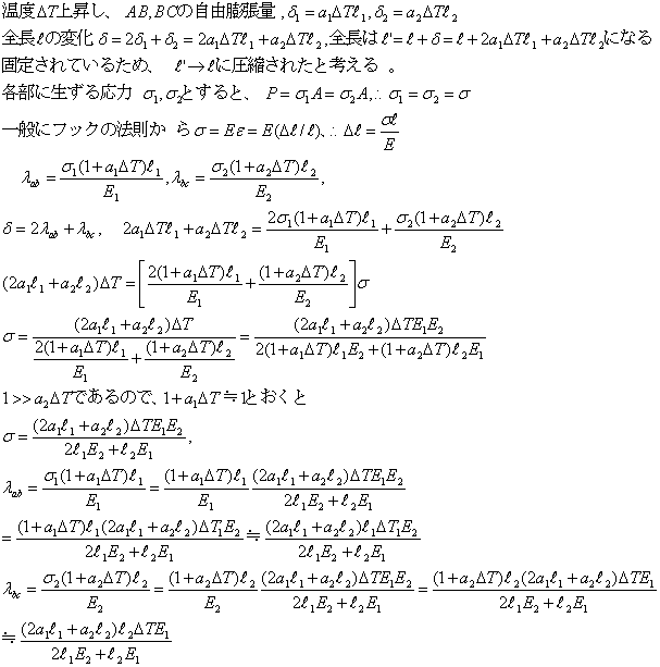 図のように両端が壁に拘束された断面積Aの複合棒がある。この状態から温度ΔTだけ上昇した場合、生ずる応力と棒ABおよび、BCの伸びλab、λbcをそれぞれ求める。