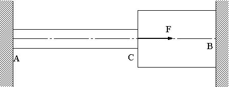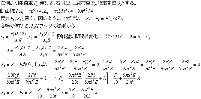 図のように長さがl/2で、直径がdと3dの丸棒が連結されて、左端は剛体壁に固定され、右端は剛体壁とλの隙間がある。この状態でC点にCB方向のFの大きさの荷重を作用させ、3dの丸棒の右端を剛体壁に接触させる。左右の剛体壁に生ずる反力PlとPrを求める。弾性係数は両材ともEとする。