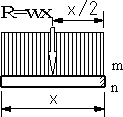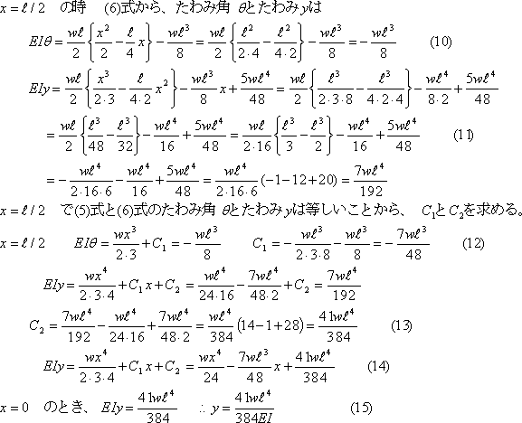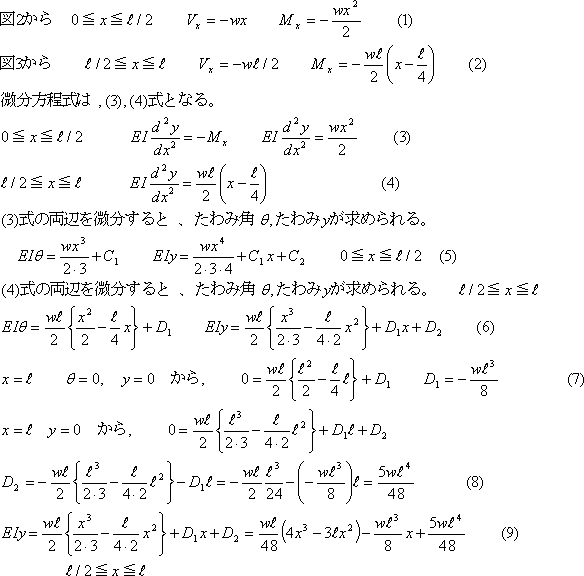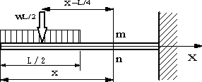 図の長さLの片持ちばりの自由端から半分の長さに単位長さ当たりwの等分布荷重が作用している場合に、せん断力Vx、曲げモーメントMx、たわみの式、自由端におけるたわみを求める。