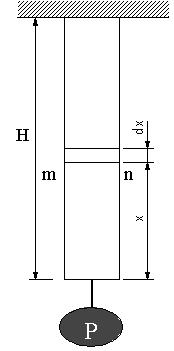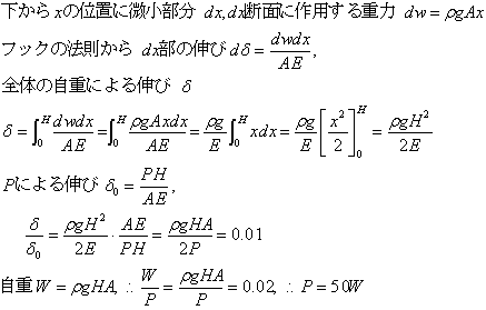 高さがH、断面積Aの棒がつるされている。この棒に重りPが作用しているとき、棒の自重による伸びが重りによる伸びに対して、1%以内なら自重を無視して考えたい。棒の密度をρとして棒の重さに対して錘は何倍以上ある必要があるか。棒の縦弾数係数をEとする。