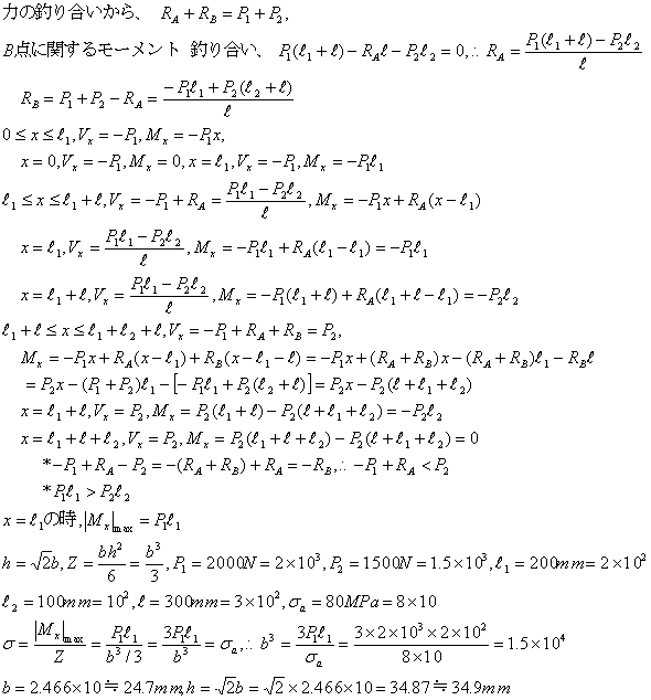 Cはりの断面は一様で、高さhが幅bの√2倍の長方形とすると、b,hはいくらに取れば安全か。ただし、P1=2000N、