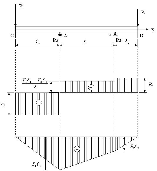 図に示すような両側にl1、l2の張り出しをもつ両端突出はりがある。ただし、P1>P2、l1>l2とし、xはC点を原点に取る。