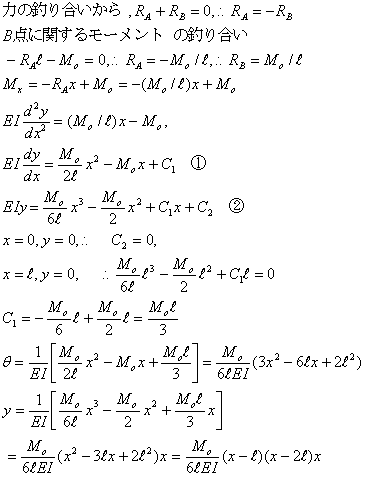 図のように、単純支持はりのA点にモーメントMoが作用するときの両支点の反力とたわみ角、たわみの式を求める。