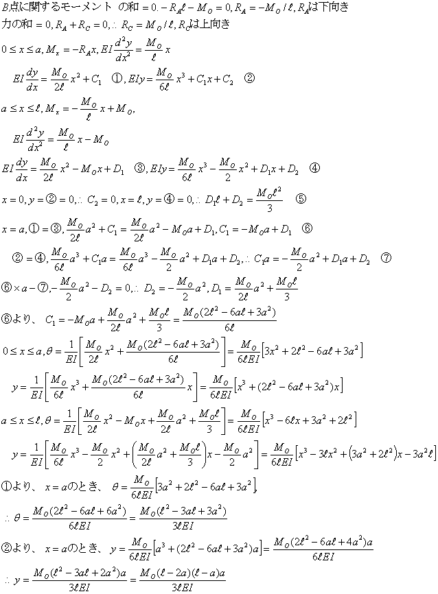 図の梁の場合のたわみ角、たわみの式を求める。さらに、C点のたわみ角、たわみを求める。梁の断面二次モーメントI、ヤング係数Eとする。
