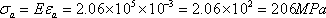 許容ひずみεa=0.001=10-3, E=206GPa=2.06×105MPaを代入すると許容応力σaは |