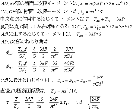 図のように、段付き丸棒が、両端A,Bにて剛体壁に固定されている。丸棒の中央Cに図のようにトルクT=3dPが作用している。A点に生ずるねじりモーメントとC点におけるねじれ角、せん断強さτaの時、安全な径を求める。