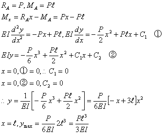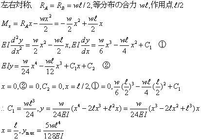 図の梁の場合に。たわみの式と最大たわみを計算する。