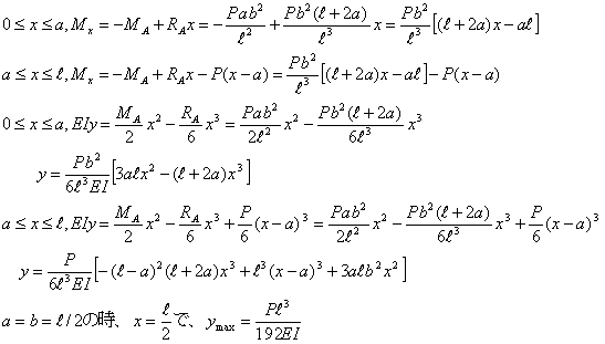 図の梁の場合に、最大曲げモーメント、せん断力と曲げモーメント、せん断力図と曲げモーメント図、たわみ曲線を求める。但し、a<bとする。