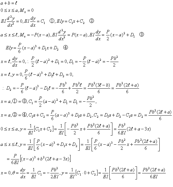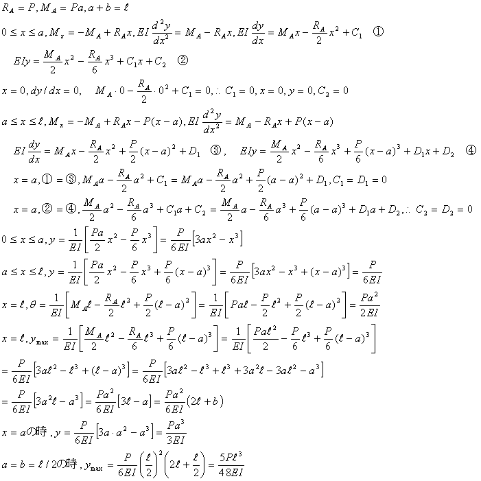 図(a),(b)の梁の場合に、たわみ曲線の式と、自由端のたわみを求める。