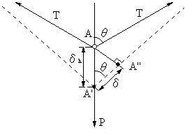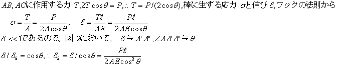 図のように回転自由に結合された長さl,断面積A、ヤング係数Eの2本の軟鋼丸棒がある。A点に荷重PをBCに直角な方向に加える時、棒に生ずる応力とA点の鉛直方向の変位を求める。変位は小さいものとして計算する。